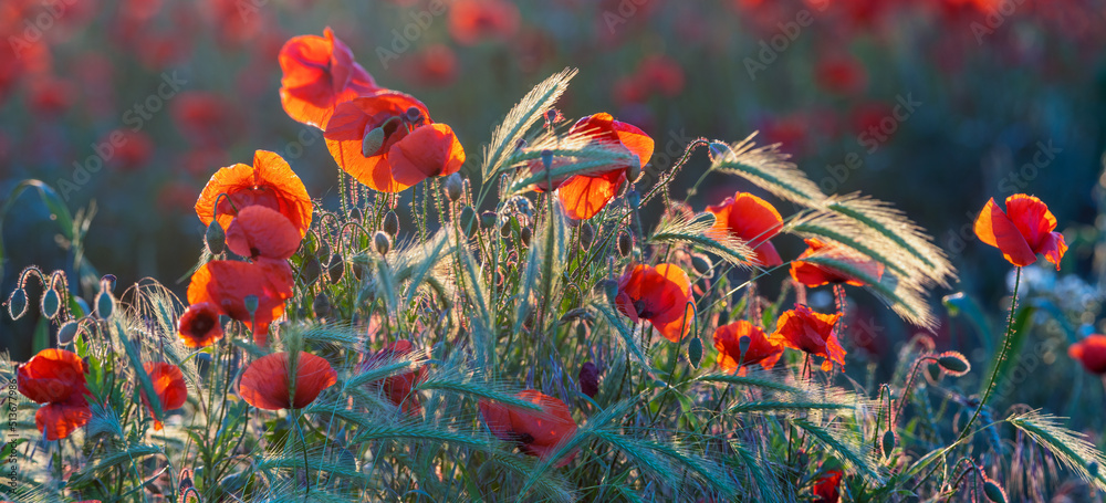 Detailed, high resolution panorama of flowering red poppies