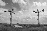 Two small modern windmills in a landscape with swamps and meadows under a sky with scattered clouds in the Noordwaard region in Biesbosch national park
