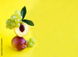 Balance of nectarines and green grapes on the yellow background.Close-up. Location vertical.