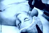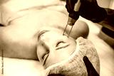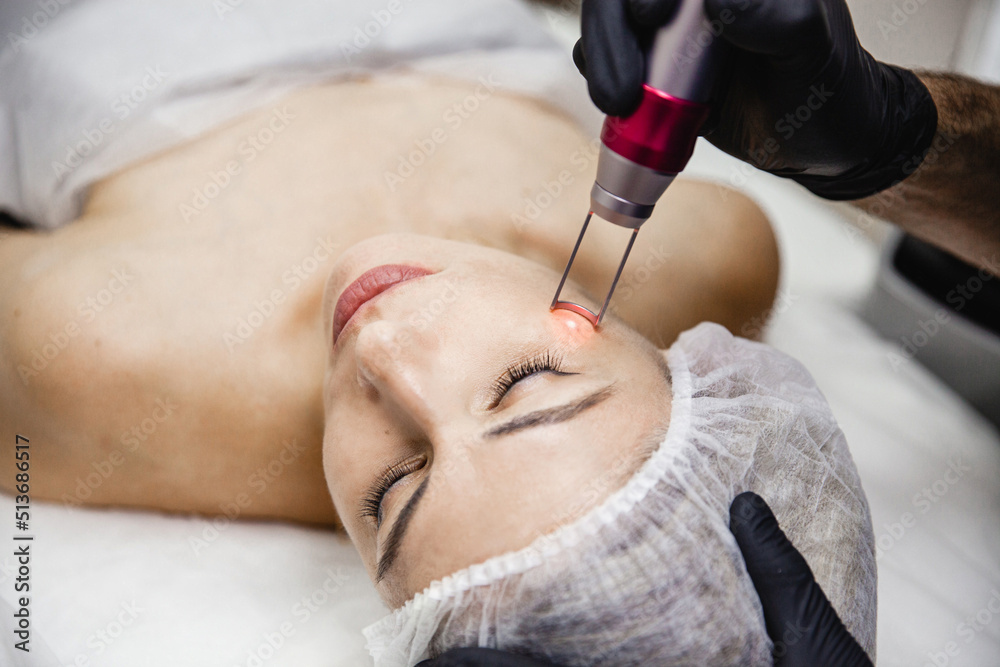 young woman getting facial laser treatment by cosmetician in spa clinic. The doctor in black gloves uses a laser to clean the face.