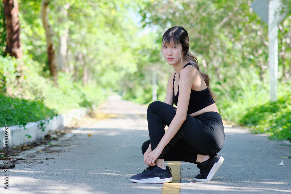 Running shoes runner woman tying laces in preparation for a summer run in a forest park. Jogging girl motivation exercise healthy fit living