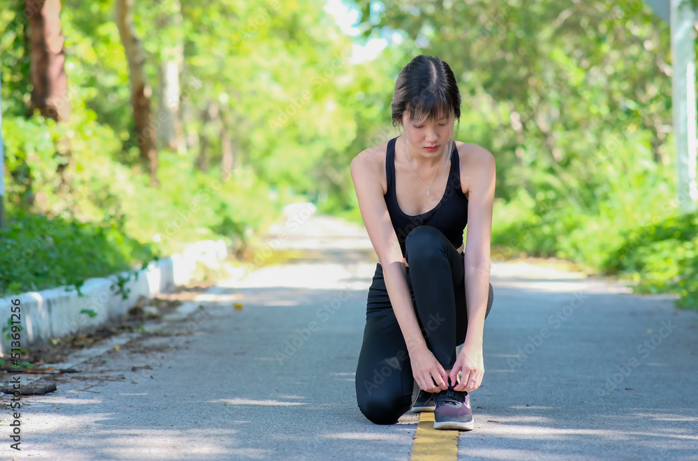 Running shoes runner woman tying laces in preparation for a summer run in a forest park. Jogging girl motivation exercise healthy fit living