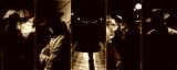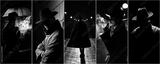 Collage of photos in noir style with a man in raincoat and hat in the rain with an umbrella with a cigarette in night city