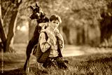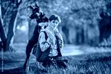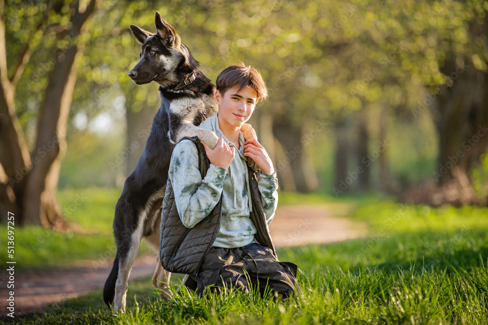 a boy with a dog walk in the park on a sunny spring evening, sit on the grass. Friendship of man and animal, healthy lifestyle.
