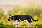 Puppy East European Shepherd walks and runs in the summer forest