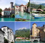 France travel collage. Beautiful view of city and lake on a sunny day.