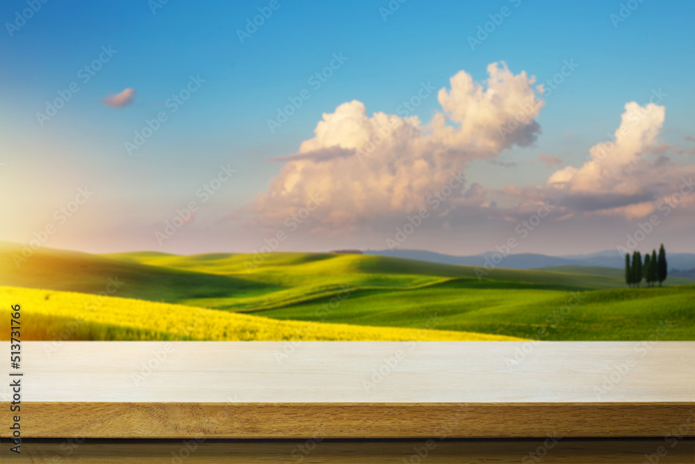 Art Empty wooden table on blurred green italian tuscany farm field background. Mockup for countryside outdoor product design and display.