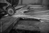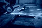Worker cutting steel rectangular pipe in construction site.