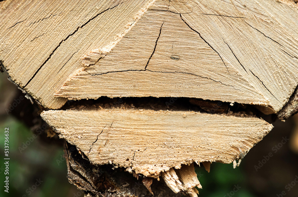 A cut of a tree trunk with growth rings and cracks. Close-up of a chopped tree