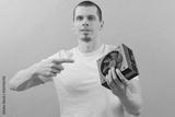 A man shows with a pointing finger on a computer power supply on a blue background. Object. Panel. Psu. Energy. Voltage. Energetic. Power Supply. Source. Heat. Connector. Equipment. Interface. System