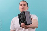 A man shows a computer power supply towards the camera on a blue background. Electric Fan. High-tech. Ac. Element. Section. Watt. Ventilator. Personal Computer. Tool. Distribution. Resource