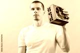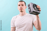 A man shows a computer power supply in front of his face on a blue background. Electronic. Supply. Communication. Component. Connection. Down. Gesture. Hardware. Human. Negative. Unit. Electric