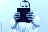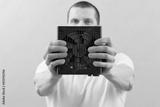 A man holds a computer power supply in front of his face on a blue background. Electrical. Cooler. Fan. Box. Device. Part. Desktop. Peripheral. Powerful. Object. Panel. PSU. Energy. PC