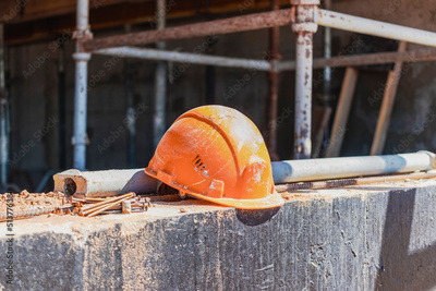 Cement foundation of a cottage at a construction site. Construction of the foundation of a new house, construction helmet at a construction site.