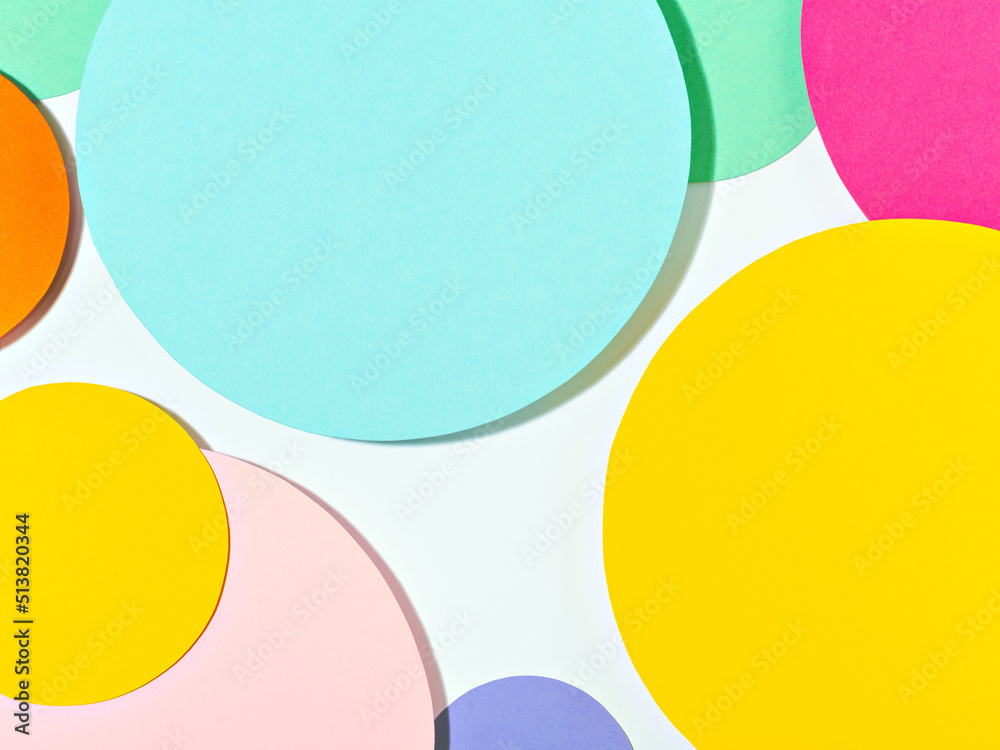 Minimal geometric shapes background in pastel pink, blue, yellow and green colours. Abstract bright colored paper circles. Creative concept, layout, template for styling and design. Space for text.