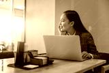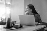 Smiling business asian woman working in office use computer and looking away. Blurred background
