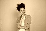 Positive african american curly young brunette woman, in orange casual shirt, looking away thoughtfully, coming up with an idea, contemplating a plan, daydreaming, stand on isolated pink background