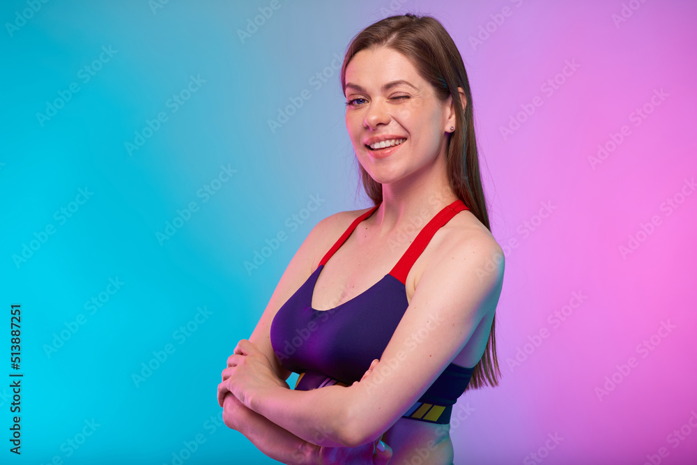 Smiling winking sporty woman in fitness sportswear standing with arms crossed. Female fitness portrait isolated on neon multicolor background.