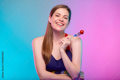 Happy smiling sporty woman in fitness sportswear with red tomato on fork. Female fitness portrait isolated on neon multicolor background.