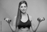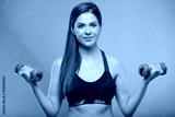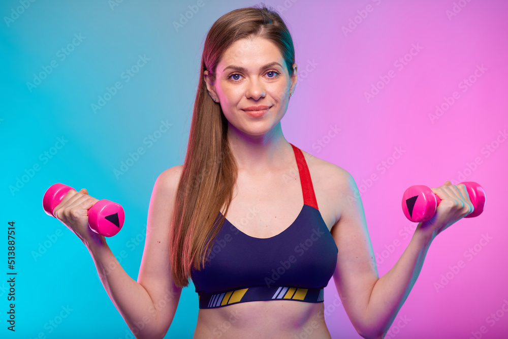 sporty woman with long hair dressed in fitness bra doing exercise with pink dumbbells. Female portrait isolated on neon color background.