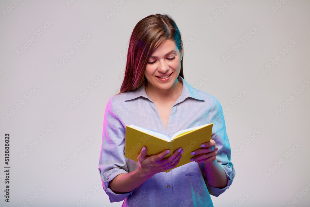 Smiling woman teacher or student reading book. isolated female portrait on gray background