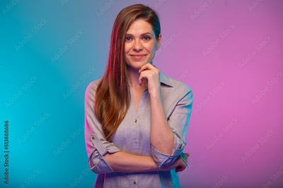 Thinking happy woman touching her chin portrait with neon lights. Businesswoman isolated on neon multicolored background.