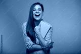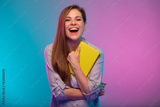Happy emotional teacher or student woman with mouth open holding book, portrait with neon lights colors effect. Female model isolated on neon background