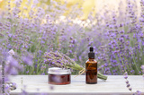 Amber essential lavender oil bottle. Violet lavendar field in Provence.