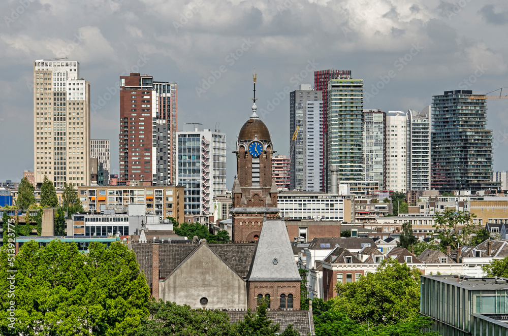 Rotterdam, The Netherlands, June 24, 2022: the tower of Arminius church in front of the modern highrise of the city center