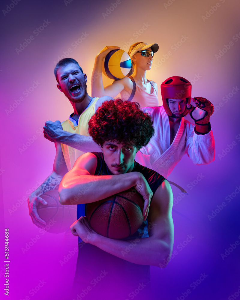 Sports collage with professional sportsmen, volleyball and basketball players, boxer over purple smoky background. Sport, team, competition, ad concept