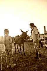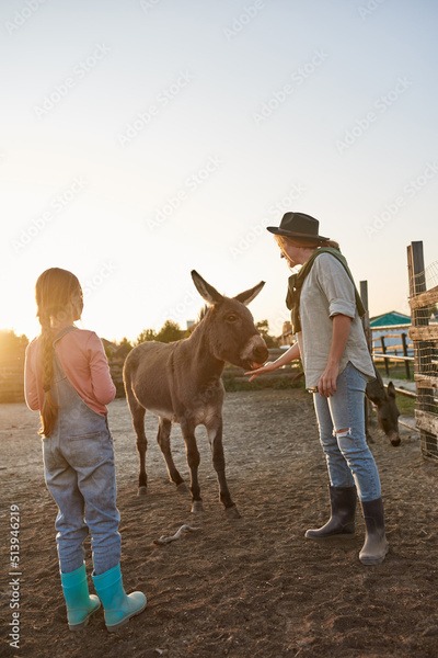 Mother and daughter feeding donkey in paddock