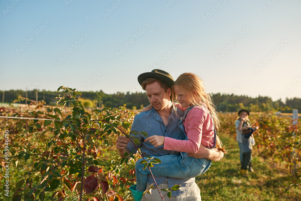 Father hold daughter in arms and check fruit plant