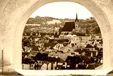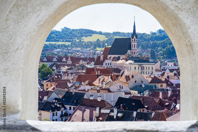 Townscape of Cesky Krumlov (Czech Republic) seen from a window opening in "Cloak" bridge.