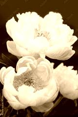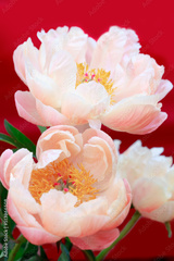 Close up of a peony flower with the stamens on red background.