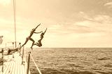 Carefree excited young women jumping from boat to swim in the ocean. Two friends on a holiday cruise together jumping from boat into the ocean to swim. Excited young women jumping off boat together