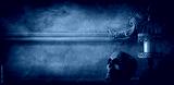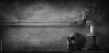 Mystical Halloween still-life background. Skull, candlestick with candles, old fireplace. Horror and witchery.
