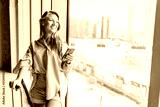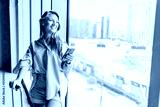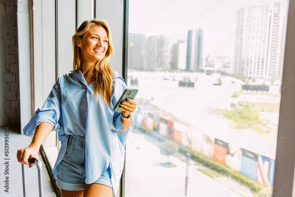 Cropped shot of a young woman looking at out the airport window while waiting for departure. Photo of a young woman using a cellphone in an airport.