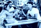Happy friends sitting at a table in a summer bar laughing and drinking beer