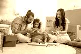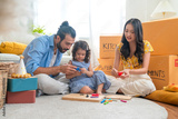 Happiness Family sitting in casual living room playing moulds from plasticine at home, Girl daughter sculpt figures from soft colorful Clay Dough with her parents with joyful smile watching takecare