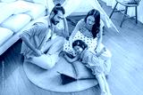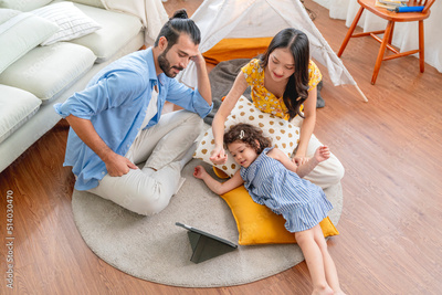 Happiness Family sitting in casual living room with wireless Internet connection at home, Girl daughter watching video on tablet, parents is cheering up her online study together with laugh smile fun