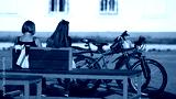 Two girls are sitting on a bench outside after a bike ride. There are bicycles nearby. Selective focus.