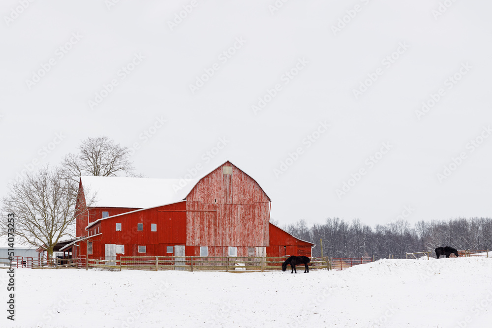 Red barn in the snow with horses in the pasture | Winter in Amish Country, Ohio