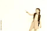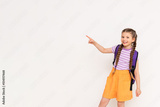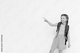 A child with a satchel points with his index finger at your advertisement on a white isolated background. Preparatory summer courses for children. Copy space.