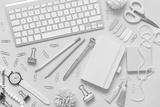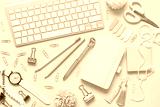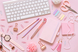 Notebook, Pink school girly accessories and keyboard on pastel pink Top view, mockup