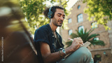 Young italian guy with ponytail and stubble sits with headphones on street bench listens to music and makes sketches with pen on piece of paper on cityscape background