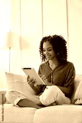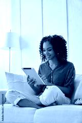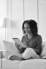 Happy mixed raced African teenage girl sitting on sofa holding using tablet device reading e book, doing online shopping in ecommerce store or surfing social media websites in apartment.