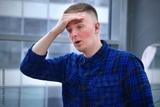 Young handsome ill sick man worker at office is suffering from heat, high temperature, headache and migraine, holding hand on forehead. Symptoms of the coronavirus, covid-19. Red face, blushing.