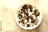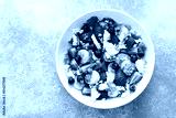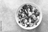 Fruit and berry salad with fresh strawberry, blueberry, banana, cottage cheese and granola with almond. Healthy food, diet breakfast
