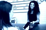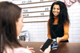 Cashless payment concept. Female visitor paying for order using modern technology, friendly black waitress give card reader machine for customer make payment transaction using cellphone