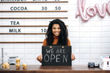 Happy African American female barista or waitress, owner of a coffee shop, stands holding a sign we are open behind the bar counter and friendly smiling